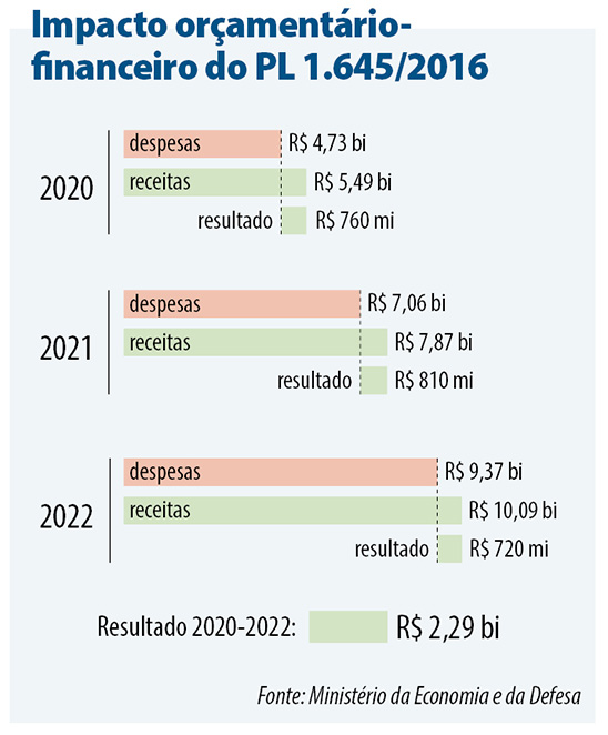 Citando um estudo dos Ministérios da Economia e da Defesa, Arolde destacou que a reestruturação já proporcionará um superávit de R$ 2,29 bilhões aos cofres da União até 2022 (confira na tabela ao lado).
