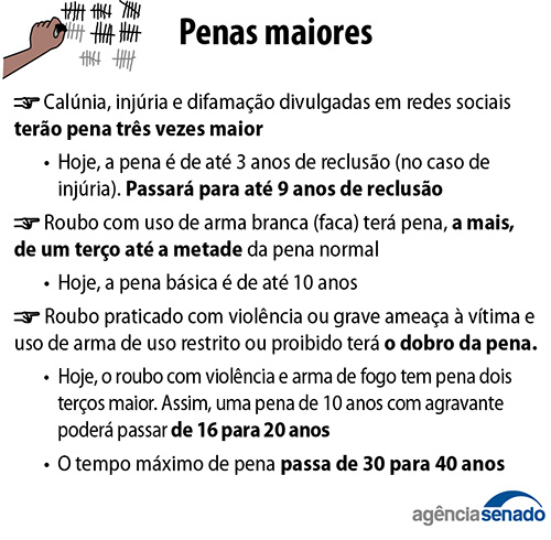 O pacote aumenta a pena de vários crimes. O homicídio praticado com arma de fogo de uso restrito ou proibido (fuzis, por exemplo) será punido com 12 a 30 anos de reclusão. A legislação atual não tem essa previsão específica. Crimes como difamação com o uso de redes sociais e roubo com uso de arma branca ou com uso de armas restritas também terão a pena aumentada.
