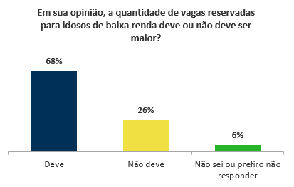 O projeto também aumenta, de dois para três, o número de vagas reservadas às pessoas idosas com renda igual ou inferior a dois salários-mínimos no sistema de transporte coletivo interestadual. Para 68% dos participantes, essa quantidade de vagas deve ser maior. Em oposição, 26% acham que não deve, e 6% não souberam opinar.