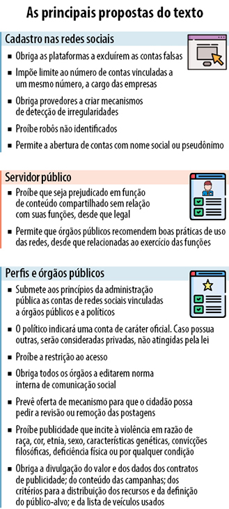 O texto submete a comunicação institucional em redes sociais de todos os órgãos e empresas do Estado aos princípios constitucionais da administração pública. A mesma regra vale para as contas de agentes políticos, como presidente da República, governadores, prefeitos, parlamentares, ministros, secretários de estados e municípios, entre outros. Essas contas não poderão bloquear o acesso de outras contas às suas publicações.