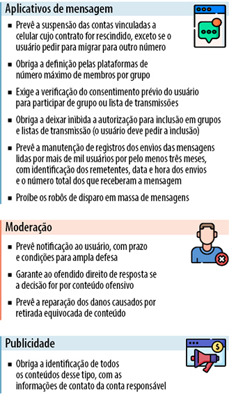 O texto cria ainda um conselho para supervisionar as redes sociais e os aplicativos de mensagem, que será responsável por definir diretrizes para a autorregulação e um código de conduta para o setor; avaliar os relatórios trimestrais e publicar indicadores; e analisar os procedimentos de moderação.