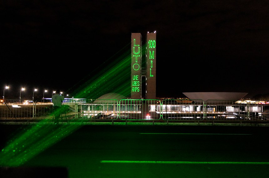 As torres do edifício principal do Congresso voltam a receber, nesta terça-feira (11), projeções de frases alusivas à pandemia e ao movimento estudantil brasileiro. Na segunda-feira (10), as mais de 100 mil vítimas por covid-19 no país já haviam sido lembradas em evento similar.
