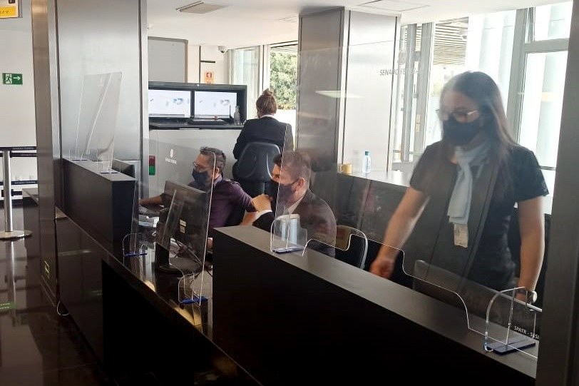 Senadores, servidores e convidados que estão comparecendo ao Senado nesta semana de esforço concentrado encontram uma sinalização especial que visa manter o distanciamento. Adesivos nos pisos, indicações de redução de capacidade dos elevadores e proteções de acrílico nas portarias estão entre as medidas que envolveram diversas áreas da Casa, como polícia, logística, marketing e administração patrimonial.