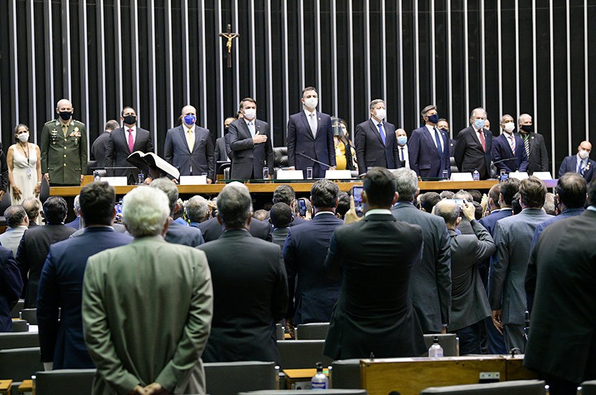 A pandemia de covid-19 deu o tom da solenidade de abertura dos trabalhos de 2021 no Congresso Nacional, nesta quarta-feira (3). A referência à doença, que já matou mais de 227 mil brasileiros, esteve presente nos discursos das autoridades e na própria organização do evento, que marcou a retomada das atividades do Poder Legislativo. Na rápida cerimônia, a máscara foi item de uso obrigatório para todos os participantes. A sessão solene no Plenário também contou com um reduzido número de convidados este ano, para evitar aglomeração. Além disso, foram seguidas várias outras medidas para prevenir o contágio pelo vírus, como a distância mínima segura mantida entre os militares presentes.