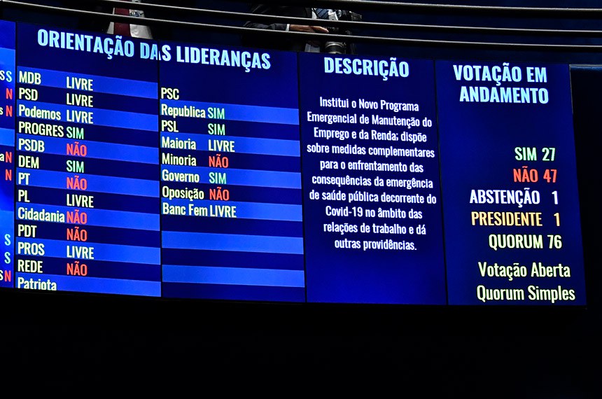 O Plenário do Senado rejeitou, nesta quarta-feira (1º), a Medida Provisória (MP) 1.045/2021, que originalmente criou novo programa de redução ou suspensão de salários e jornada de trabalho durante a pandemia de covid-19, mas sofreu tantos acréscimos na Câmara dos Deputados que foi chamada de “minirreforma trabalhista” por senadores. Foram 47 votos contrários, 27 votos favoráveis e 1 abstenção. A MP 1.045/2021 será arquivada.