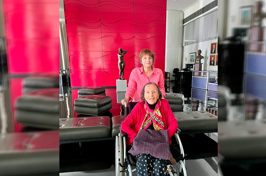 Aos 94 anos, Marianne usou uma cadeira de rodas para se deslocar pelo Senado. Ergueu-se, porém, para posar sorridente ao lado da filha, Isabella Peretti, para algumas fotos.