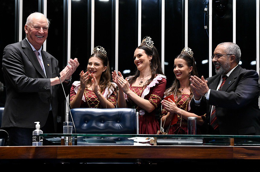 Ireneu Orth lembrou que Bento Gonçalves é a terra do vinho e da uva e vem registrando muito progresso e desenvolvimento nos últimos anos. De acordo com o senador, todos ficam encantados pela beleza de sua natureza, sua cultura e sua gente. As promotoras da Fenavinho Ana Paula (imperatriz), Liége e Thaís (damas de honra), estiveram no Plenário, onde entregaram convites e brindes para os senadores. Elas também posaram para fotos com a bancada do Rio Grande do Sul.