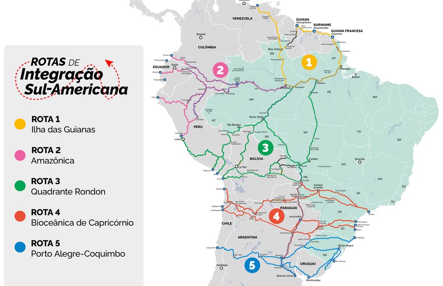 As cinco Rotas da Integração Sul-Americana afetam os 11 estados brasileiros que fazem fronteira com países da região. Elas envolvem um total de 190 projetos, como rodovias, ferrovias, hidrovias, portos e aeroportos, além de infovias e linhas de transmissão de energia.