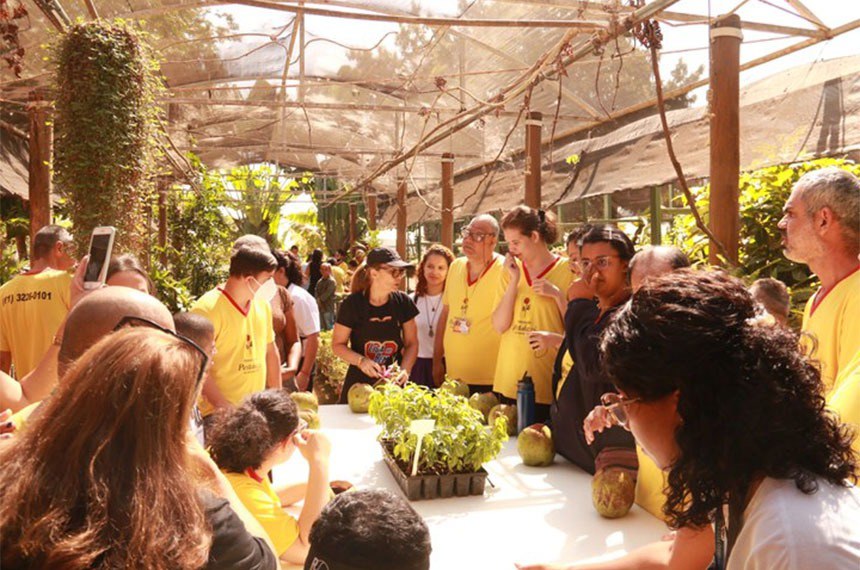 Os atendidos, que possuem deficiências múltiplas, percorreram a trilha de acessibilidade do viveiro e ouviram histórias contadas pela servidora Danielle Abud. O passeio incluiu ainda a confecção de arranjos botânicos, utilizando insumos naturais do local, como mudas e cascas de coco.