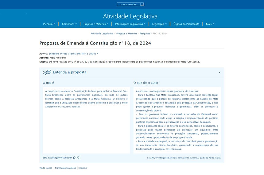 Segundo Pacheco, o uso de IA pode reduzir a desigualdade no acesso à informação. Conforme explicou o presidente, a partir desta terça-feira estará disponível, na página de tramitação da matéria e também no Portal e-Cidadania, o texto gerado por inteligência artificial e com linguagem simplificada, feita a devida revisão humana, de todas as propostas de emenda à Constituição, projetos de lei complementar, projetos de lei do Congresso Nacional e medidas provisórias em tramitação. A partir do ano que vem, todas as proposições legislativas apresentadas terão um resumo gerado por inteligência artificial e em linguagem simplificada.