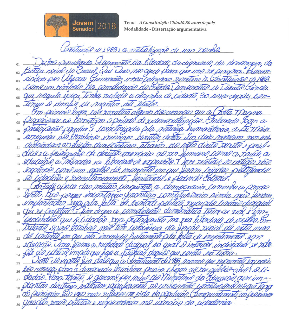 A estudante Larissa Pires Santos vai representar o Mato Grosso no projeto. Ela foi classificada com a redação “Constituição de 1988: a materialização de um sonho”.