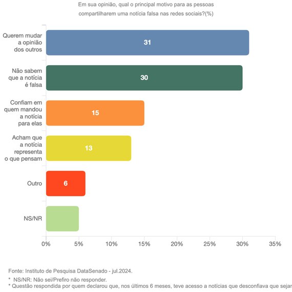 Sete em cada 10 brasileiros já viram alguma notícia falsa, de acordo com pesquisa realizada pelo DataSenado. Quando perguntados sobre o motivo para a disseminação de notícias falsas, 31% acreditam que quem compartilha esse tipo de notícia quer mudar a opinião dos outros. Para 30%, as notícias falsas são compartilhadas por desconhecimento sobre sua veracidade.