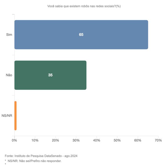 Os levantamentos do DataSenado também investigam a percepção sobre a influência da desinformação e o uso de novas tecnologias. A maioria (91%) concorda que as redes sociais influenciam "muito" a opinião das pessoas. Além disso, embora 65% dos cidadãos saibam da existência de contas controladas por robôs, 35% ainda desconhecem essa ferramenta de disseminação em massa. Dos que conhecem, 80% defendem que esses perfis automatizados deveriam conter um aviso claro sobre sua natureza.
