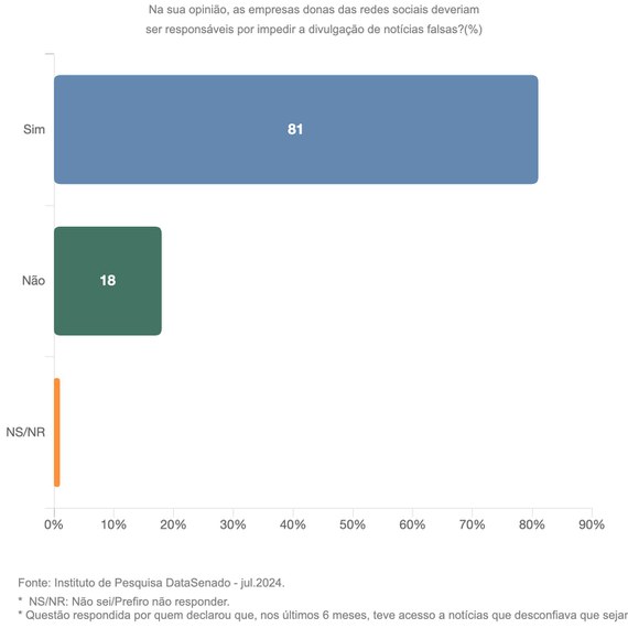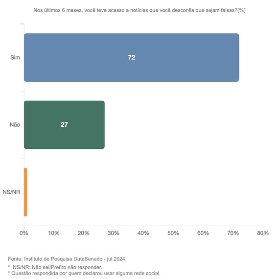 Outra pesquisa realizada pelo DataSenado mostra que 72% da população se diz "muito preocupada" com a quantidade de informações falsas que circulam nas redes sociais. Essa apreensão se reflete na percepção de risco: nove em cada dez brasileiros (91%) afirmam que as fake news representam um perigo para a sociedade.